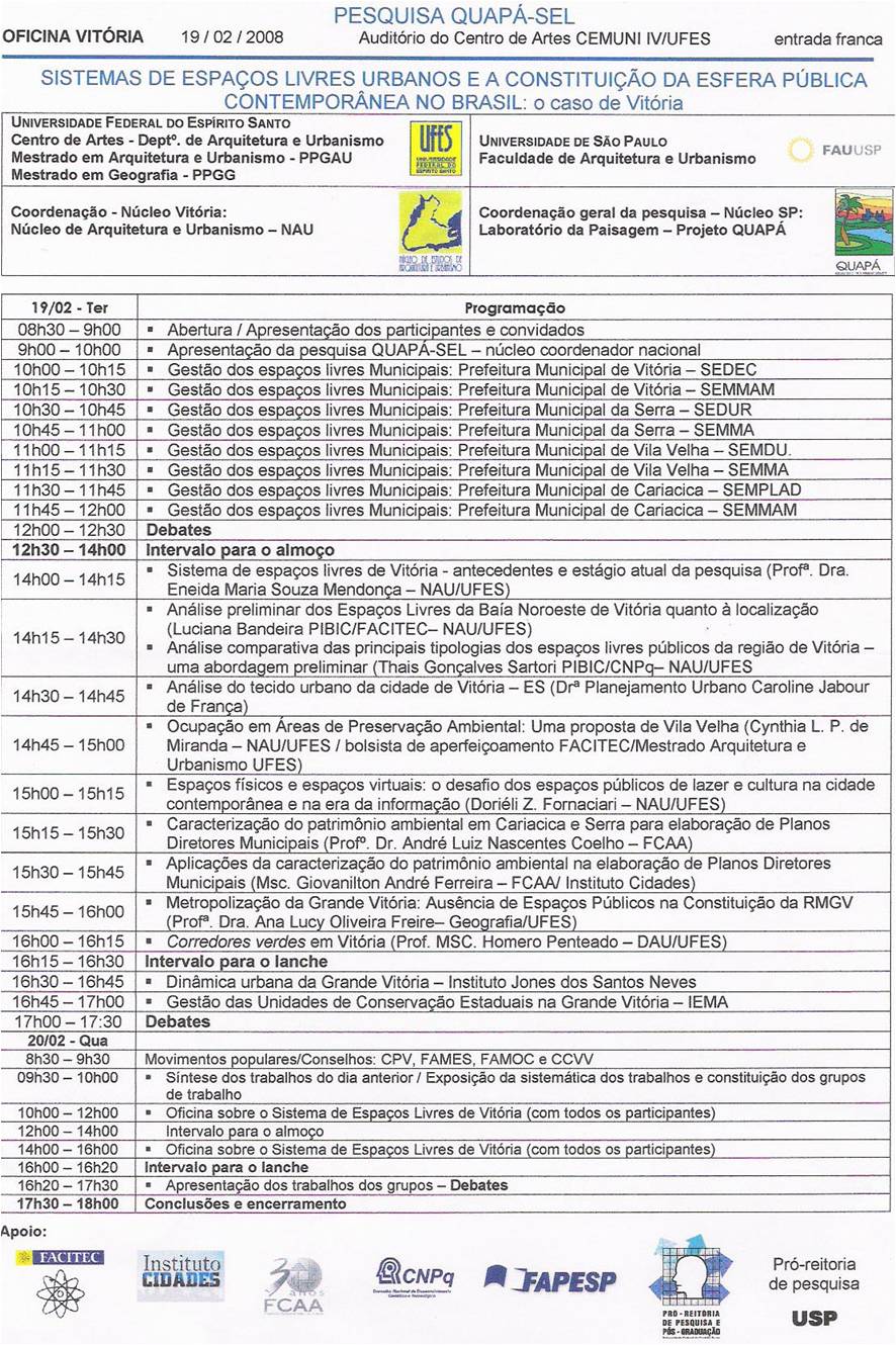Na seqüência, apresentaram-se as novas pesquisadoras do Núcleo QUAPÁ SEL Vitória. São elas: Thais Sartori / Análise comparativa das principais tipologias de Vitória (PIBIC/CNPq); Luciana Bandeira de Oliveira / Análise preliminar dos espaços livres na Baía Noroeste de Vitória (PIBIC/CNPq); Cynthia L. P. de Miranda / Ocupação em áreas de preservação ambiental: uma proposta para Vila Velha (Bolsista de Aperfeiçoamento / FACITEC); Caroline Jabour de França / Análise do tecido urbano da cidade de Vitória/ES. A arquiteta está se integrando à pesquisa, após Doutorado realizado em Milão sobre o desenho urbano da cidade de Vitória, onde divide a cidade em zonas de tipologias de edificação e ocupação em um esforço de compreensão da estruturação do tecido urbano; Doriéli Z. Fornaciari / Espaço físico e Espaço virtual: o desafio dos espaços públicos de lazer e cultura na cidade contemporânea e na era da informação / Trabalho Final de graduação (TFG) em andamento