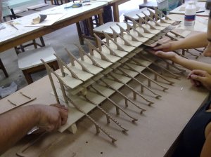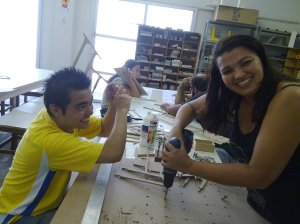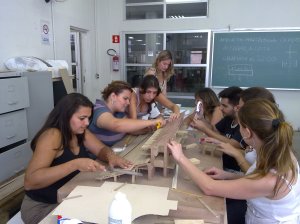 Depois de imprimir o material em papel e estudar a melhor forma para construí-la, os alunos dividiram-se me grupo e iniciaram o desenho e o corte das peças. Nessa foto, os launos estão lixando a estrutura de concreto que sustenta a arquibancada.