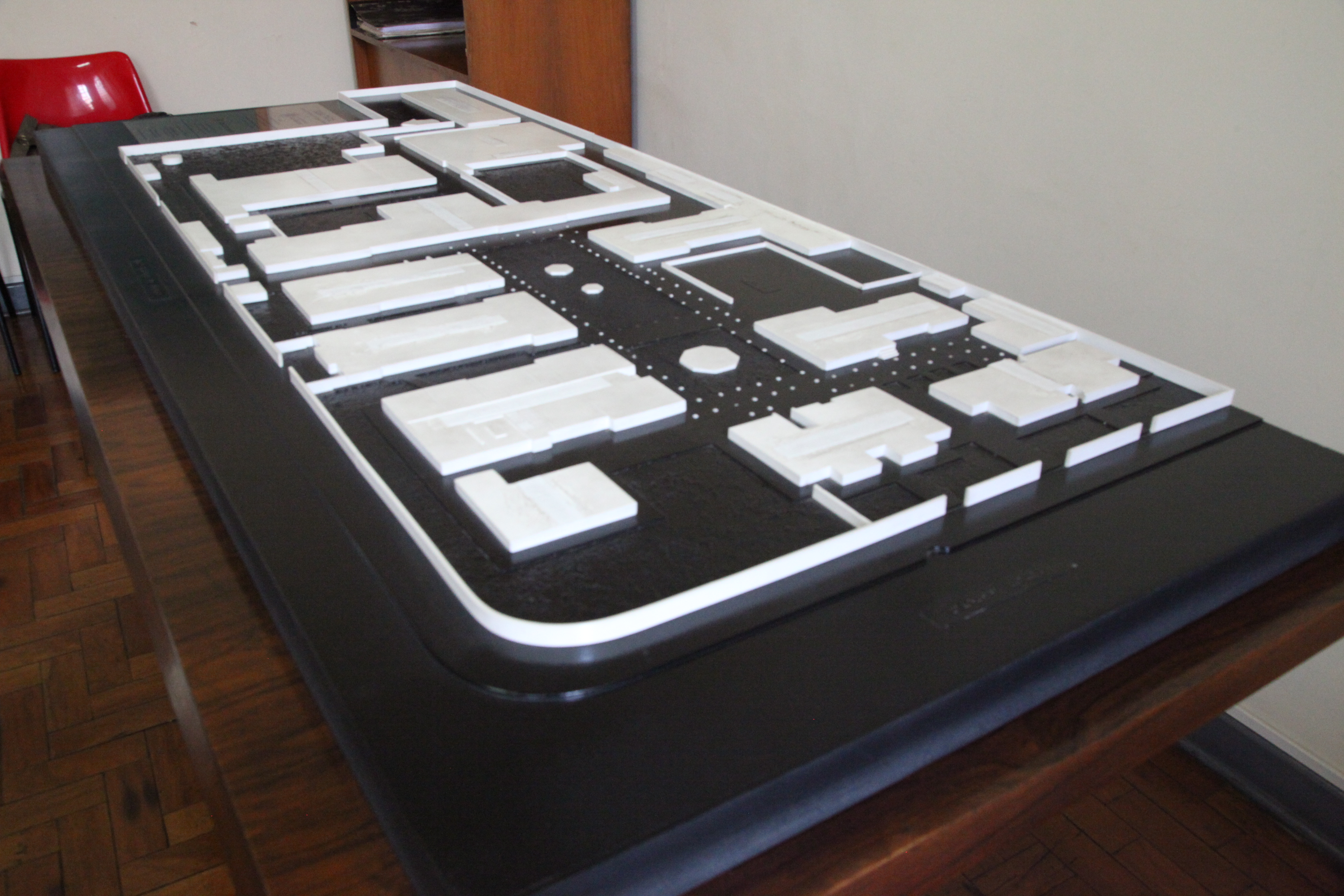 – Ainda será decidido se haverá ou não a diferenciação de cores na maquete, ou se será mantida a uniformidade da cor do MDF envernizado.