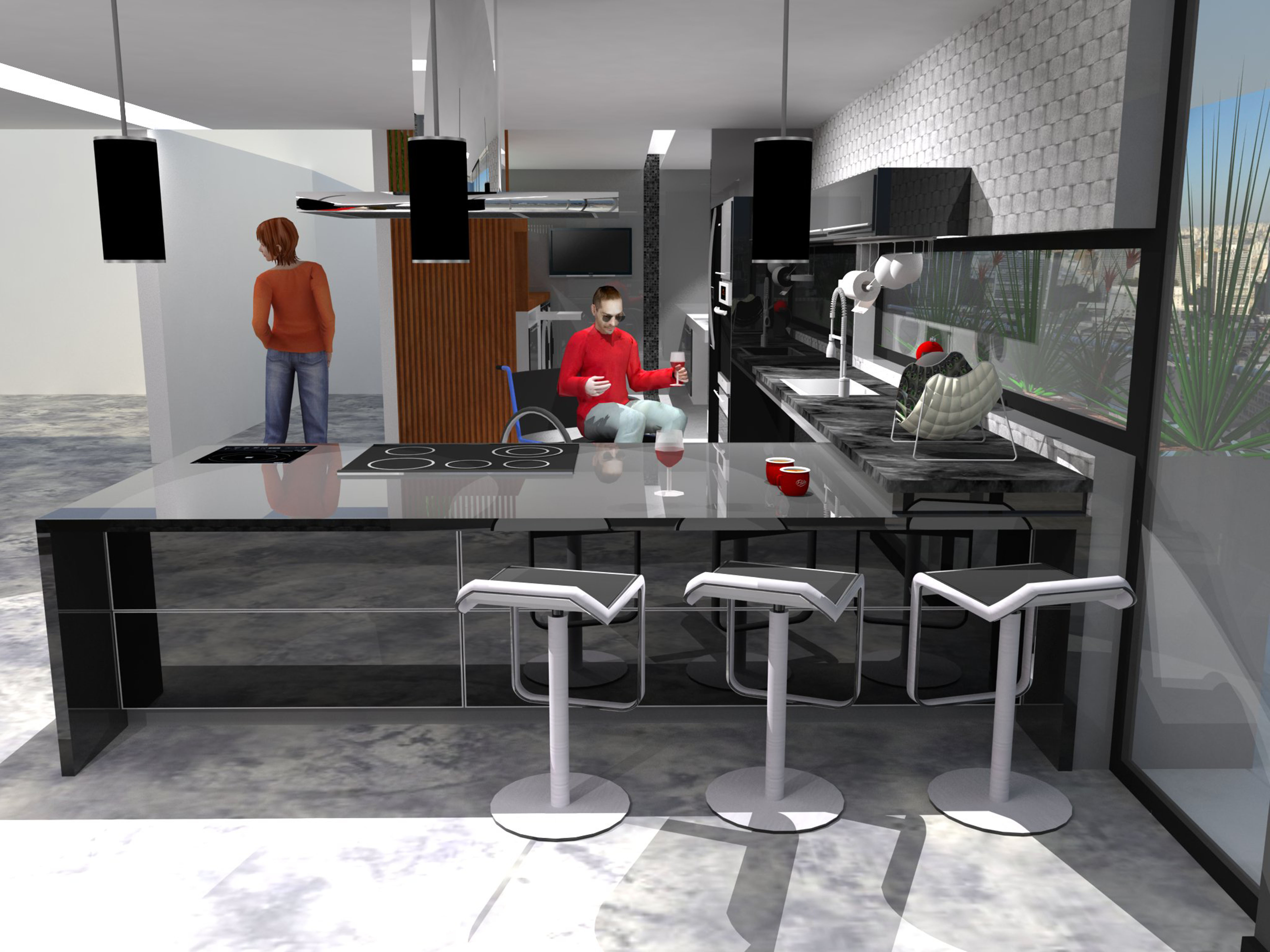 Para atender a casa sempre repleta de pessoas, o piso, seguro e de fácil manutenção, foi feito em cimento queimado; as antigas paredes da cozinha que criavam verdadeiras barreiras no relacionamento social foram retiradas e, em seu lugar, projetados ambientes com alturas e dimensões adequados para atender a todos, sem distinção: do futuro chef de cozinha que tem habilidades funcionais motoras reduzidas e se locomove por meio de cadeira de rodas aos demais membros que não necessitam do uso de tecnologias assistivas. Cozinha e área de serviços foram projetadas visando à praticidade e funcionalidade na execução das atividades cotidianas.