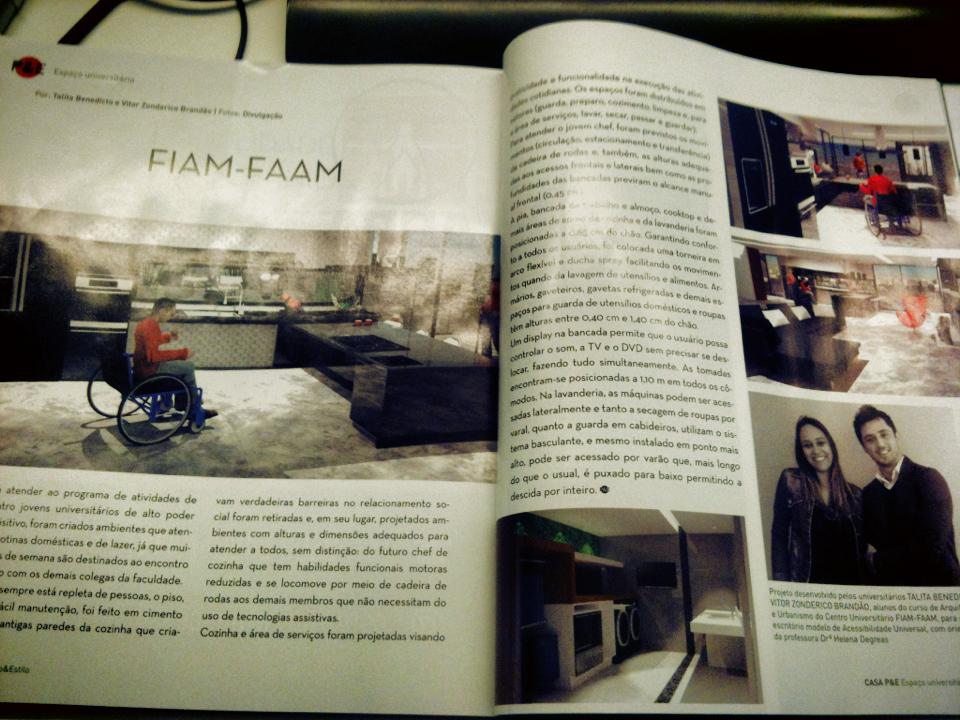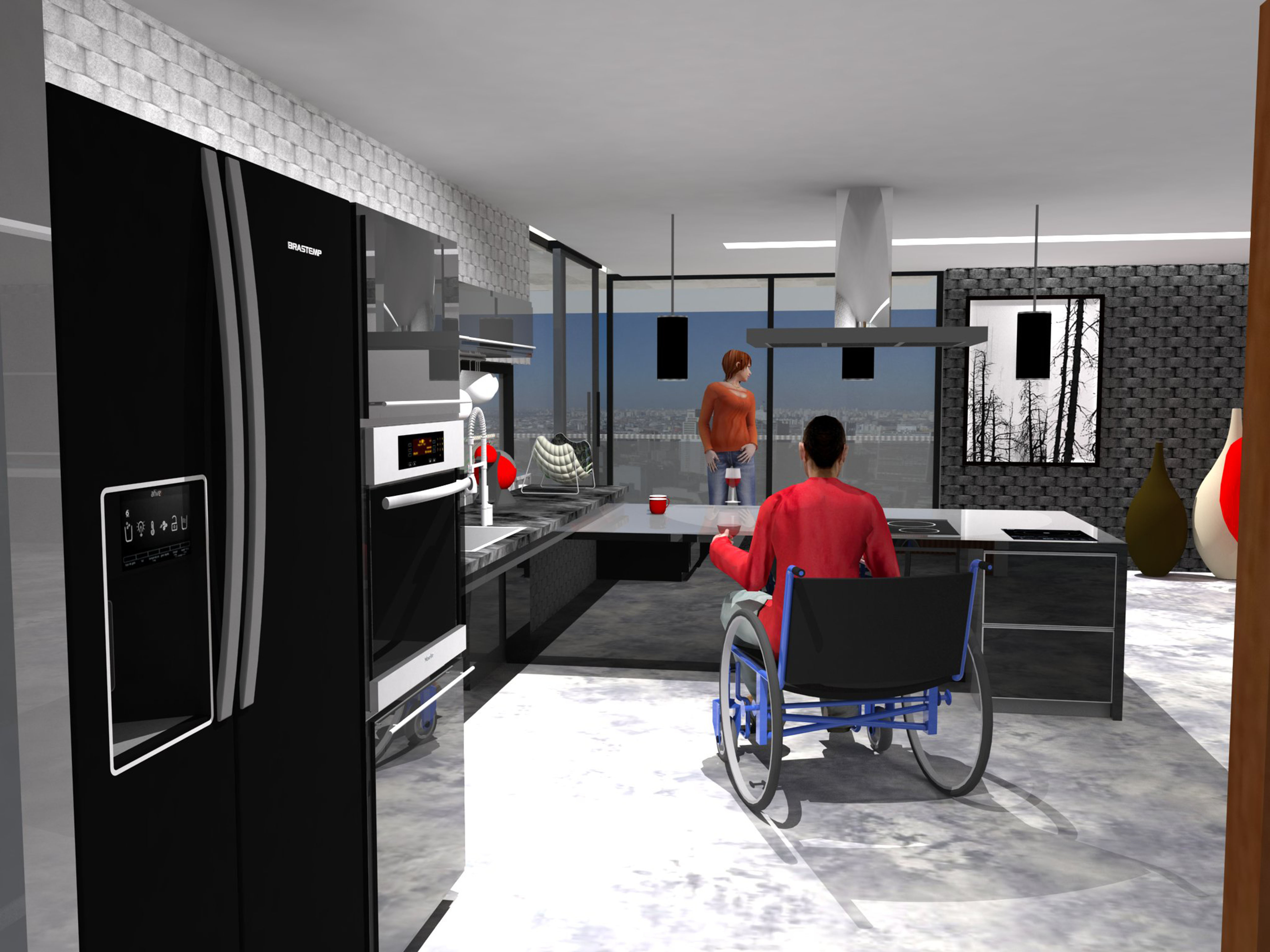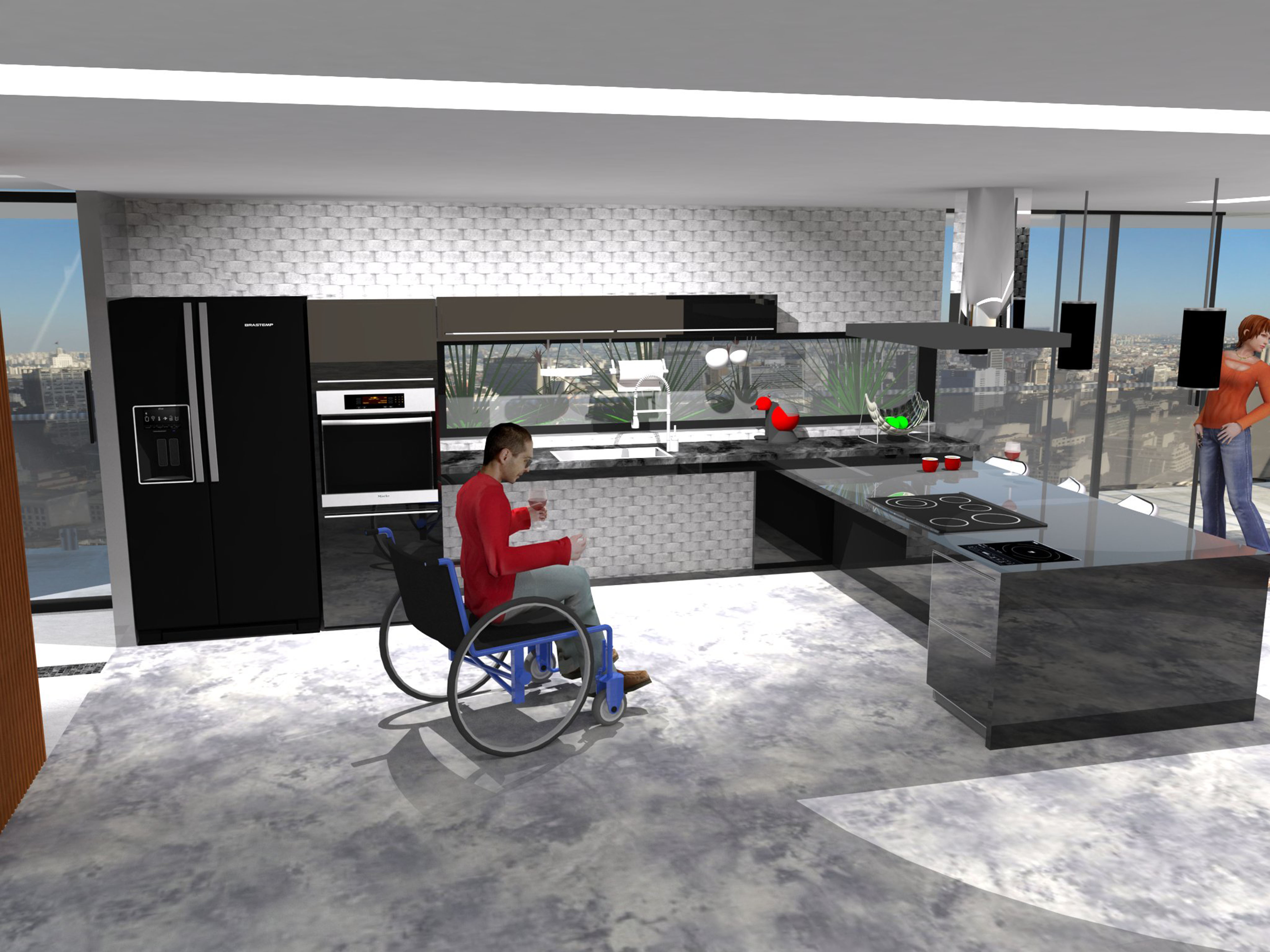 Os espaços foram distribuídos em setores (guarda, preparo, cozimento, limpeza e, para a área de serviços, lavar, secar, passar, guardar). Para atender ao jovem chef, foram previstos os movimentos (circulação, estacionamento e transferência) da cadeira de rodas e, também, as alturas adequadas aos acessos frontais e laterais bem como as profundidades das bancadas previram o alcance manual frontal (0,45cm). Tudo isso para, no dizer de seus amigos de faculdade, viabilizar o seu trabalho como “o cozinheiro oficial da república”. A pia, bancada de trabalho e almoço, cooktop e demais áreas de apoio da cozinha e da lavanderia foram posicionadas a 0,85cm do chão. Garantindo conforto a todos os usuários, foi colocada uma torneira em arco flexível e ducha spray facilitando os movimentos quando da lavagem de utensílios e alimentos. Armários, gaveteiros, gavetas refrigeradas e demais espaços para guarda de utensílios domésticos e roupas tem alturas entre 0,40cm e 1,40cm do chão.