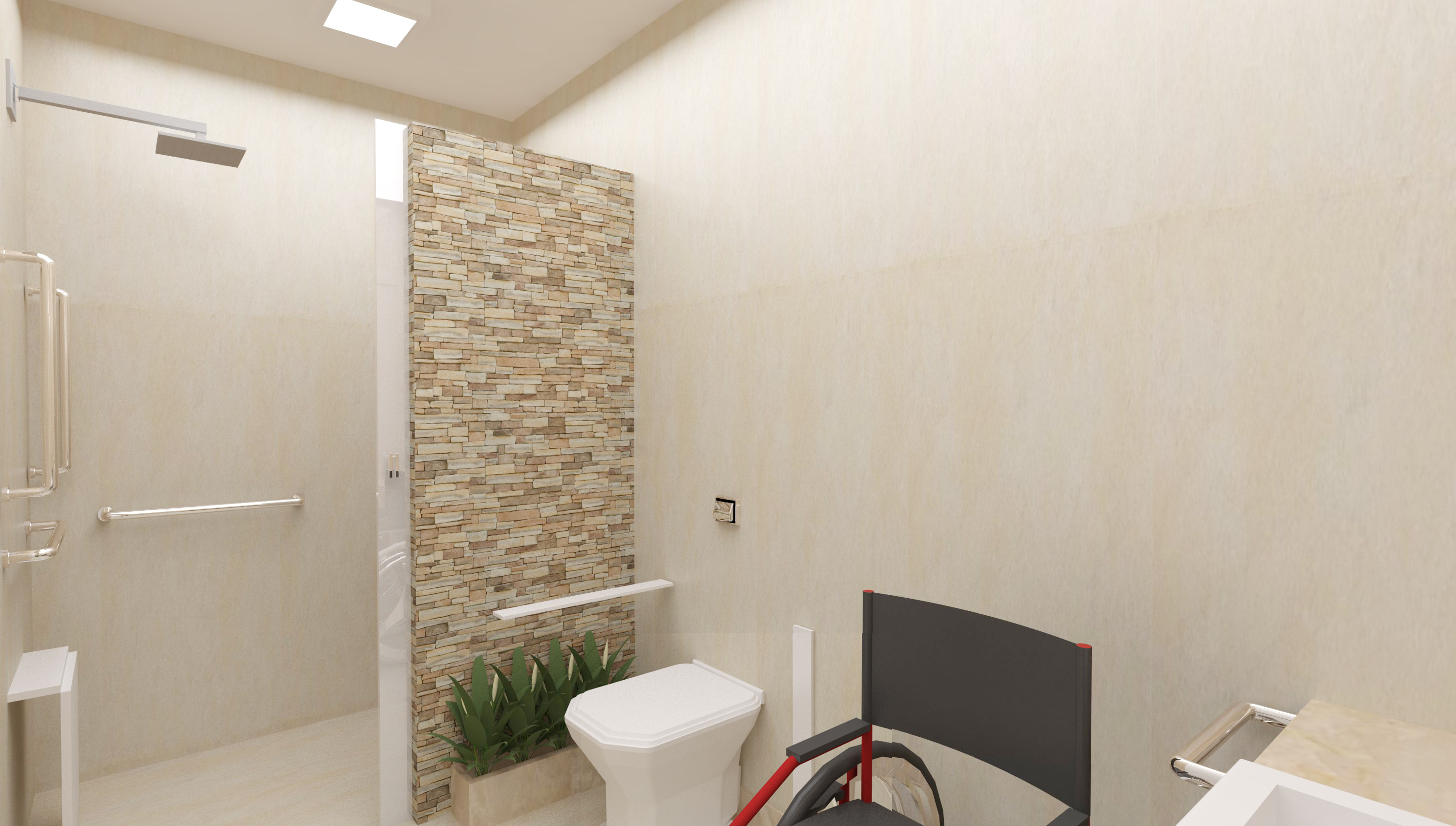 No banheiro, a bancada da pia foi projetada prevendo uma cuba que utiliza um sistema de trilhos que permite ajuste de alturas. O sifão articulado é flexível, seu posicionamento foi ajustado rente à parede, proporcionando segurança ao acesso frontal. Vaidoso, nosso cliente terá acesso visual completo a partir do espelho do banheiro graças à inclinação de 10 graus. No box, foi colocada uma cadeira de banho retrátil e duchas ajustáveis, associadas a um chuveiro. Os trilhos das portas deslizantes do box, foram embutidos no piso, com o objetivo de facilitar na circulação. Sob a bancada, foi posicionado um gaveteiro móvel.
