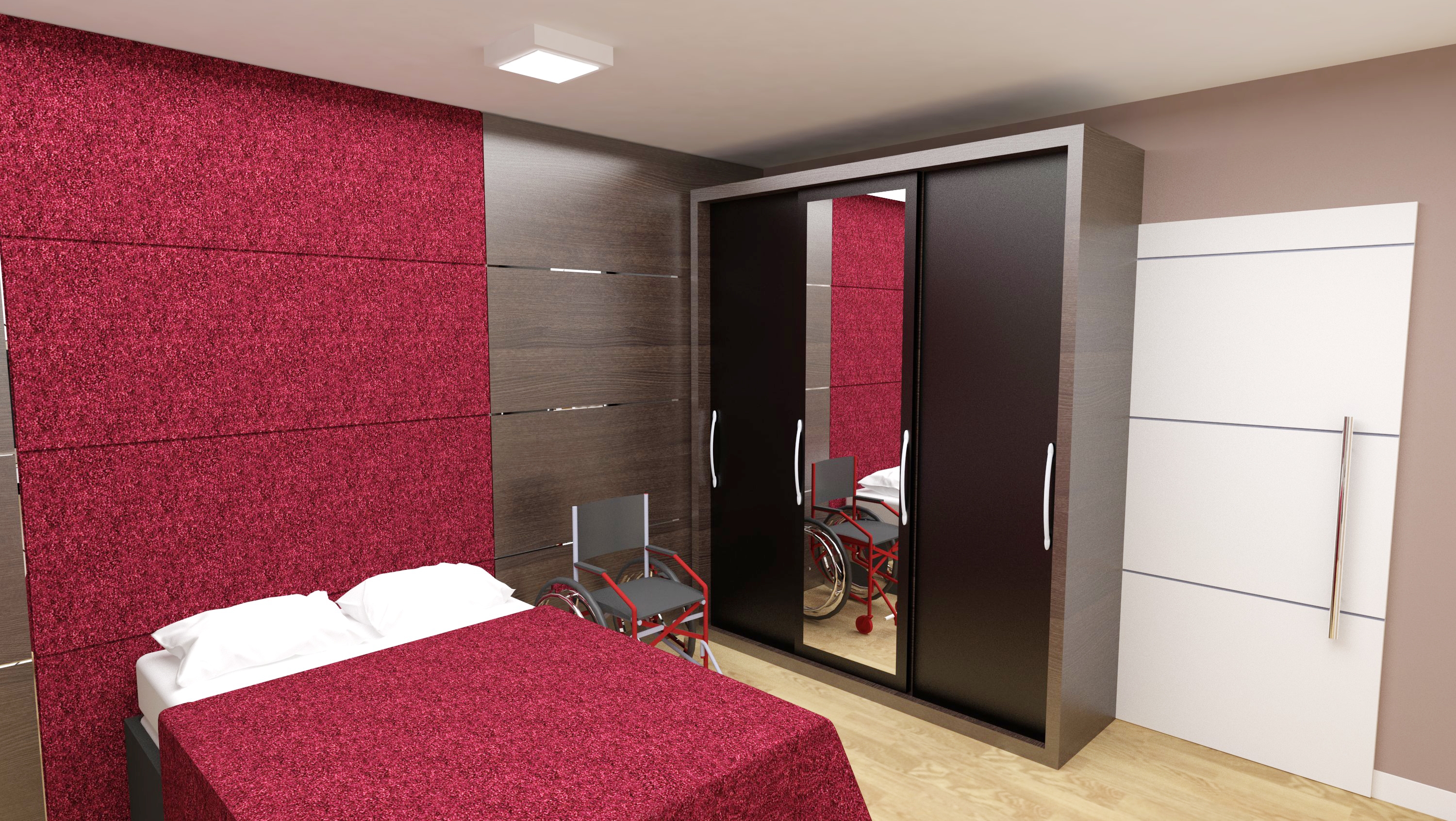 O armário apresenta gaveteiros, sapateiros e local para a guarda de objetos diversos foram distribuídos prevendo-se a aproximação lateral da cadeira de rodas. Para otimizar o espaço reduzido, os cabideiros mesmo com sua instalação mais alta, são basculantes fazendo com que o varão apresente altura compatível para o alcance manual frontal. A profundidade do armário atende o alcance manual lateral sem esforço.
