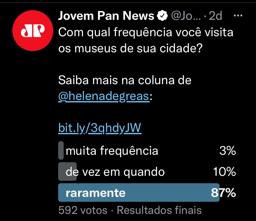 As respostas revelaram dados que assustariam até as mais conservadoras curadorias. Perguntados sobre a frequência, cerca de 3% declaram ser assíduos, 10% afirmar ir vez e outra e 87% informam raramente frequentá-los. Na interação, muitos me perguntaram por que eu não coloquei a opção nunca.